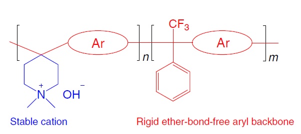 PiperION AEM由官能化聚芳基哌啶聚合物制成。聚芳基哌啶树脂材料的一般化学结构如下。